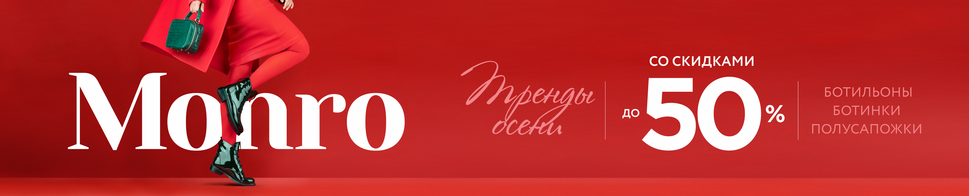 Условия акции: на ряд позиций из осеннего ассортимента ботинок, ботильонов и полусапожек установлены скидки от 25 до 50%. Количество товара по акции ограничено. С ассортиментом акционного товара можно ознакомиться в магазинах обувной сети «МОНРО». Скидка по акции не суммируется со скидкой по дисконтной карте покупателя. На приобретенные по акции товары может быть предоставлена рассрочка.