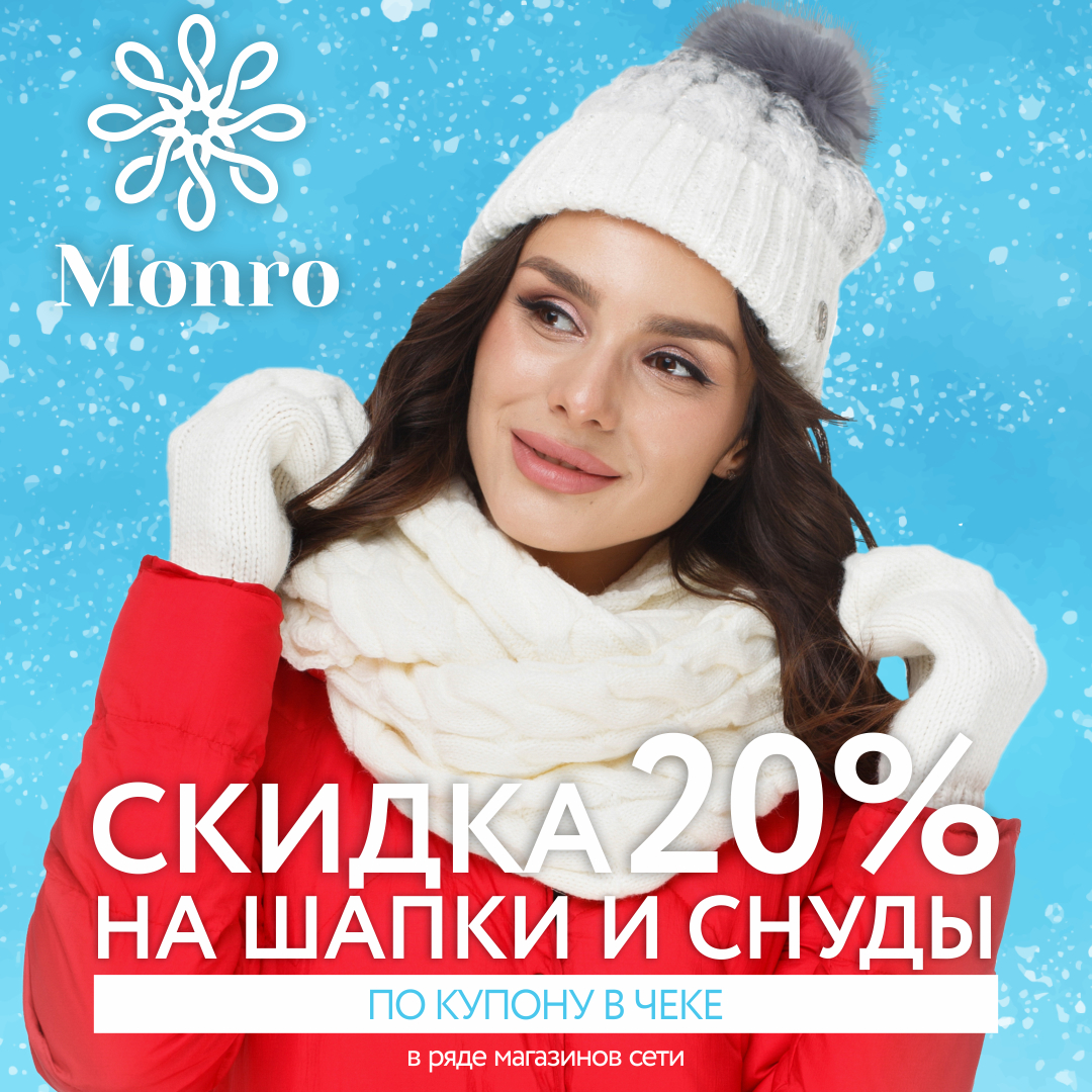 Сейчас покупать шапки, шарфы и снуды в МОНРО просто и выгодно. Особенно, если вы уже совершили какую-либо покупку в магазинах сети. Найдите на чеке купон, по которому можно при следующей покупке получить СКИДКУ 20% на шапки, снуды и палантины и наслаждайтесь созданием уникального образа с экономией. Спешите, ведь лучшие шапочки уже разбирают!