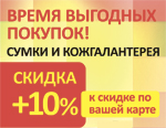 Во всех магазинах МОНРО с 16 сентября по 9 октября 2015 года при покупке 2-х и более товаров из ассортимента сумок и кожгалантереи вы можете получить скидку 10% дополнительно к скидке по вашей дисконтной карте!