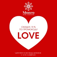 Монро всегда стремится радовать своих покупателей, и в честь 14 февраля мы решили сделать вам подарок: назовите на кассе промокод LOVE и получите скидку -15% даже на товары с уже сниженной ценой.