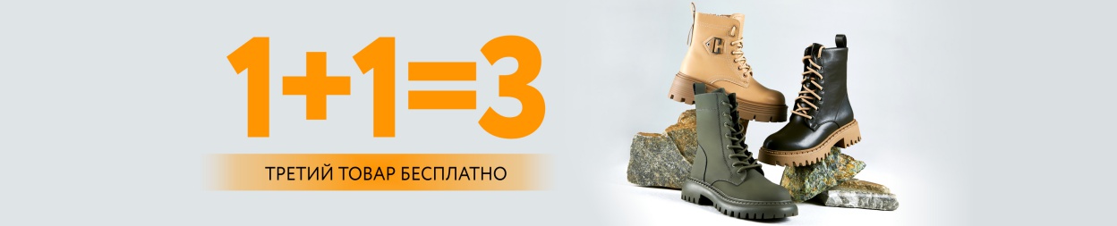 Условия акции: при покупке двух товаров только из ассортимента обуви и/или сумок, третий, наименьший по стоимости товар предоставляется со скидкой 100%. Скидка, равная 100% стоимости третьего товара, расписывается в чеке путём пропорционального уменьшения стоимости каждого приобретаемого товара. Скидка по акции не суммируется со скидкой по дисконтной карте. На товары, приобретенные по акции, может быть предоставлена рассрочка. Товары по акции невозможно приобрести по сертификатам и промокодам с определенным номиналом. Подробности у консультантов.