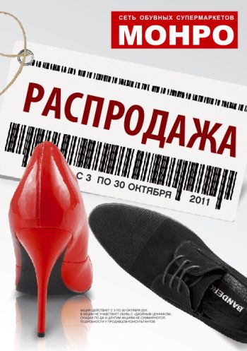 Только до 30 октября в обувных супермаркетах МОНРО невероятные скидки на ВСЮ обувь!!!!