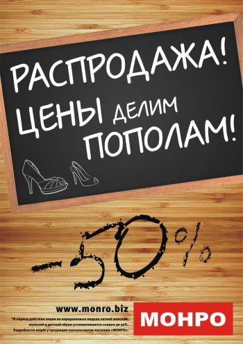 С 27 июня во всех магазинах обувной сети «МОНРО» действует скидка 50% на всю летнюю коллекцию женской, мужской и детской обуви.