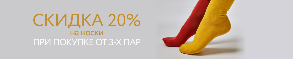 Условия акции: при покупке 3-х пар носков предоставляется скидка 20% на все носки с белым одинарным ценником в чеке. Носки с уже установленной скидкой по другим спецпредложениям могут участвовать в акции для добора количества.