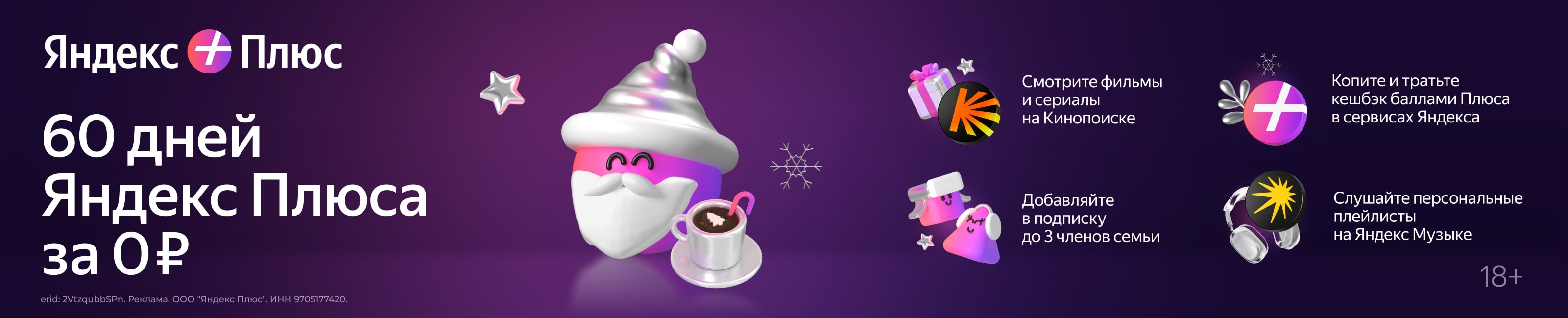 60 дней подписки Яндекс Плюс за 0 рублей.
