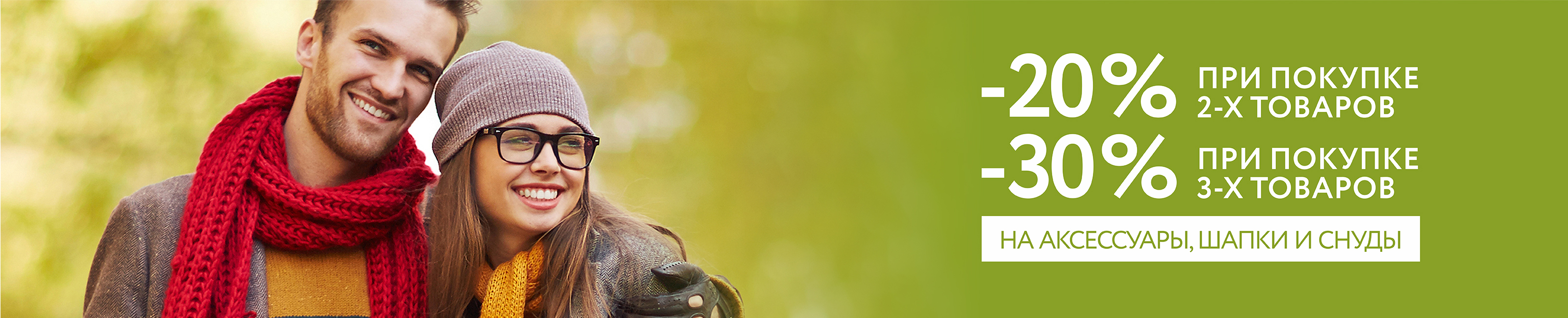 Условия акции: при покупке двух товаров из ассортимента аксессуаров: кошельков, визитниц, ключниц, брелоков, шапок, палантинов, платков и снудов, предоставляется скидка 20%, а при покупке трёх таких товаров – скидка 30%. В случае, если в чеке присутствует более трёх единиц данных товаров, скидка применяется к позициям с наибольшей стоимостью. Скидка может быть применена на товары с уже сниженной в рамках других предложений стоимостью, но в данном случае итоговая цена товара не может быть ниже цены, установленной по другим акциям. Скидка не суммируется со скидкой по дисконтной карте.