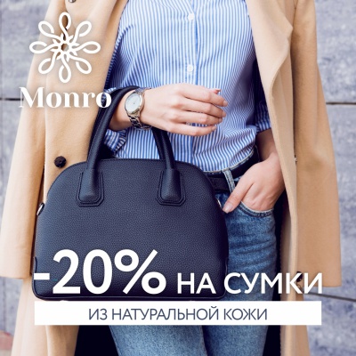 Настоящие ценители качественных аксессуаров всегда отдают предпочтение изделиям из натуральной кожи. Всем влюбленным в красивые, функциональные и долговечные сумки от МОНРО наша сеть магазинов дарит возможность насладиться приобретением вещи, которая будет каждый день радовать своим удобством с ощутимой выгодой. Уже сегодня все сумки из натуральной кожи можно купить со скидкой 20%! Не упустите эту прекрасную возможность, спешите создать завершенный образ с экономией.
