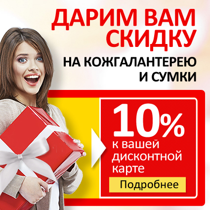С 10 февраля по 09 марта 2015 года при покупке двух и более товаров из кожгалантереи и сумок каждый покупатель, у которого есть дисконтная карта МОНРО, может получить дополнительную 10% скидку к скидке, накопленной на вашей карте.