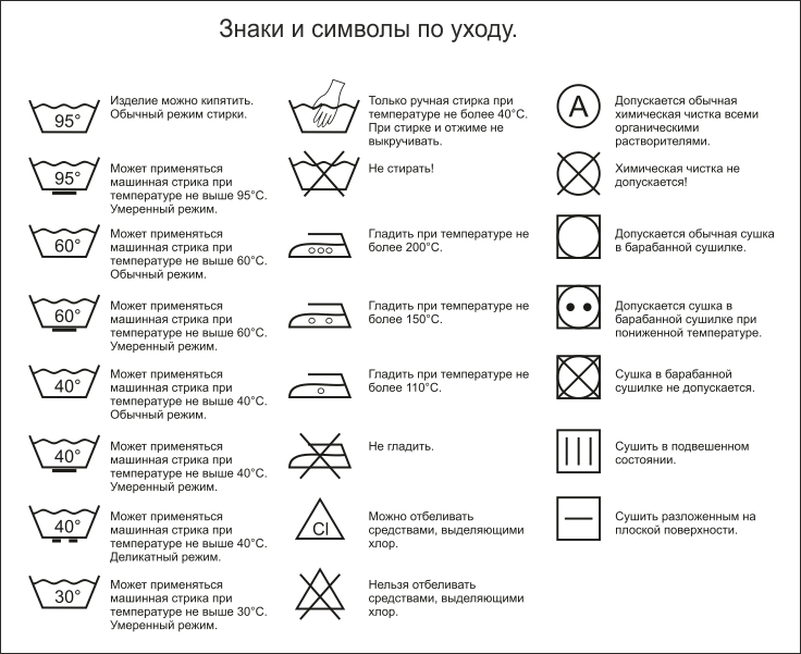 Знаки по уходу за одеждой, которые указаны на маркировочных лентах, прикрепленных к изнаночной стороне белья, одежды или указаны на упаковке, являются инструкциями, соблюдение которых, позволяет правильно ухаживать за вещами и сохранить их в отличном виде! Необходимо учитывать, что условные обозначения символов по уходу за одеждой указываются для материала, входящего в состав изделия, обладающего самыми низкими показателями термо- и химостойкости.