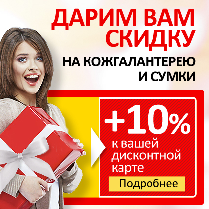 С 10 февраля по 09 марта 2015 года при покупке двух и более товаров из кожгалантереи и сумок каждый покупатель, у которого есть дисконтная карта МОНРО, может получить дополнительную 10% скидку к скидке, накопленной на вашей карте.