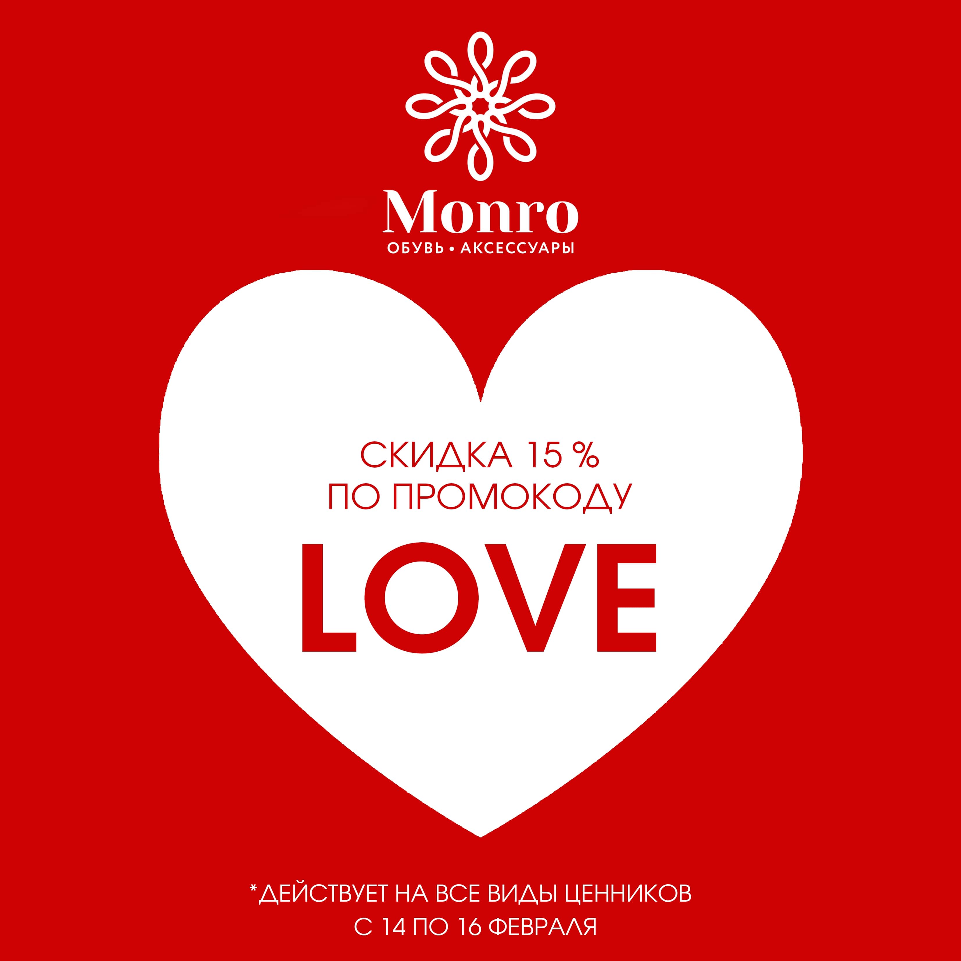 Монро всегда стремится радовать своих покупателей, и в честь 14 февраля мы решили сделать вам подарок: назовите на кассе промокод LOVE и получите скидку -15% даже на товары с уже сниженной ценой.