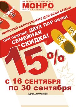 С 16 по 30 сентября при покупке двух пар обуви в обувных супермаркетах Монро предоставляется семейная скидка 15%.