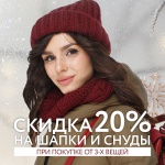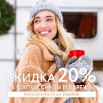 Скидка 20% на шапки, снуды, перчатки и варежки