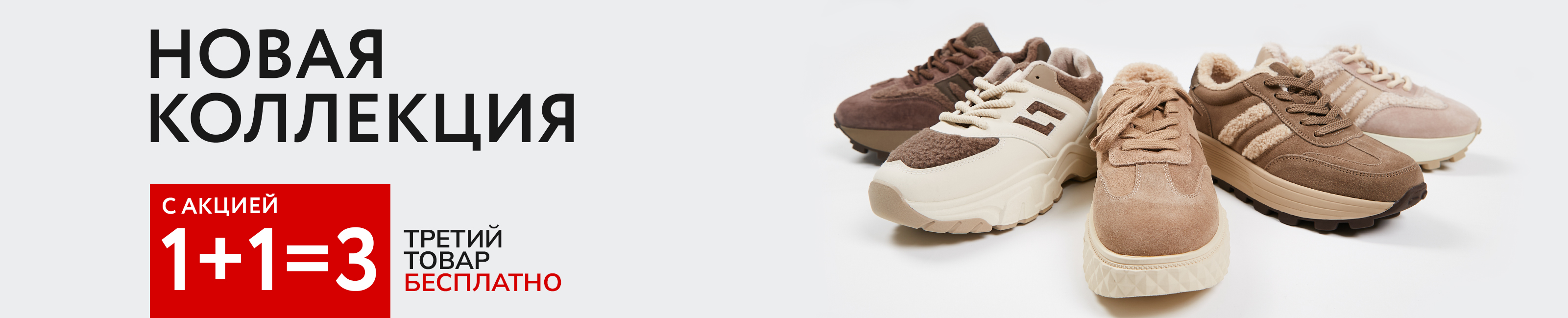 Условия акции: при приобретении товаров из ассортимента обуви, на третий товар с наименьшей ценой в чеке предоставляется скидка 100%. Скидка, равная 100% стоимости третьего товара, расписывается в чеке путём пропорционального уменьшения стоимости каждого приобретаемого товара. Скидка по акции не суммируется со скидкой по дисконтной карте и списанием бонусов. На товары, приобретенные по акции, может быть предоставлена рассрочка. Товары по акции невозможно приобрести по сертификатам и промокодам с определенным номиналом. Подробности у консультантов.