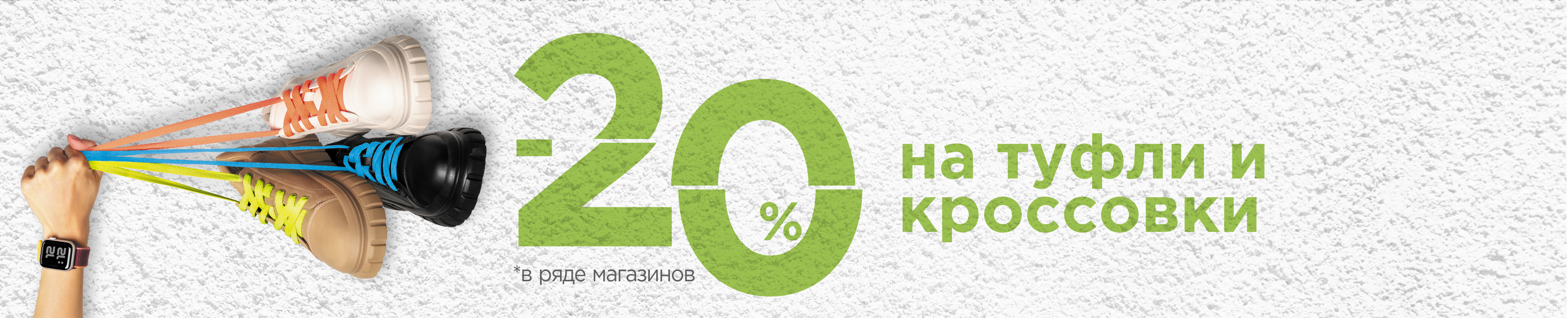 Условия акции: на ассортимент кроссовок и туфель с одинарными белыми ценниками в ряде магазинов Monro действует скидка 20%. Скидка по акции не суммируется со скидкой по карте покупателя. Товары по акции могут быть приобретены в рассрочку.