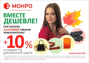 Только с 12 сентября по 3 октября при покупке 2-х и более товаров кожгалантереи вы можете получить дополнительную скидку к скидке по вашей дисконтной карте - плюс 10%.