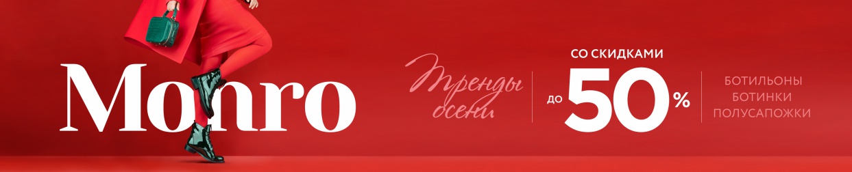 Условия акции: на ряд позиций из осеннего ассортимента ботинок, ботильонов и полусапожек установлены скидки от 25 до 50%. Количество товара по акции ограничено. С ассортиментом акционного товара можно ознакомиться в магазинах обувной сети «МОНРО». Скидка по акции не суммируется со скидкой по дисконтной карте покупателя. На приобретенные по акции товары может быть предоставлена рассрочка.