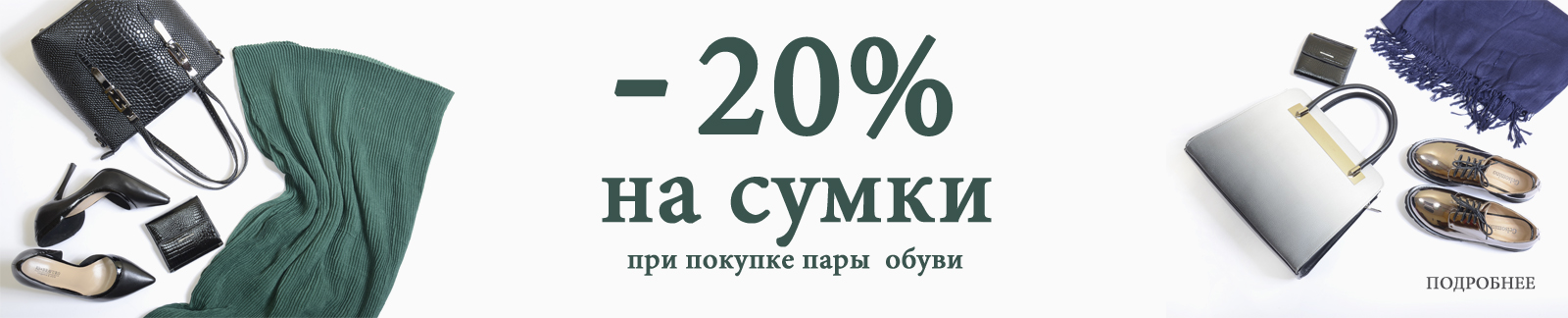 Условия акции: при покупке одной пары обуви - покупателю предоставляется скидка 20% на сумки (женские, мужские, детские). Скидка 20% распространяется только на товар с белым одинарным ценником. Скидка по дисконтной карте на данную акцию не распространяется. Скидки не суммируются.