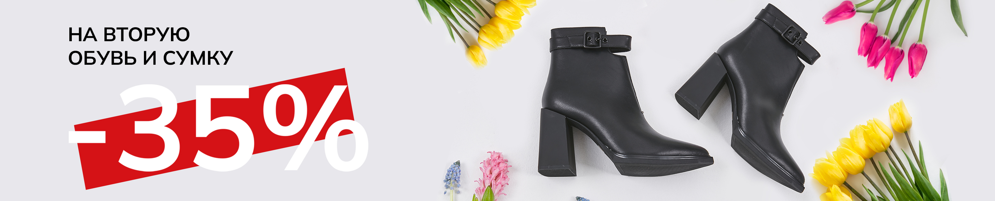 Условия акции: с 22.02.2025 г. и до уведомления об отмене акции, на второй товар в чеке из ассортимента обуви и сумок с меньшей стоимостью применяется скидка -35%. Акция не суммируется со скидкой по программе лояльности и применением бонусов.